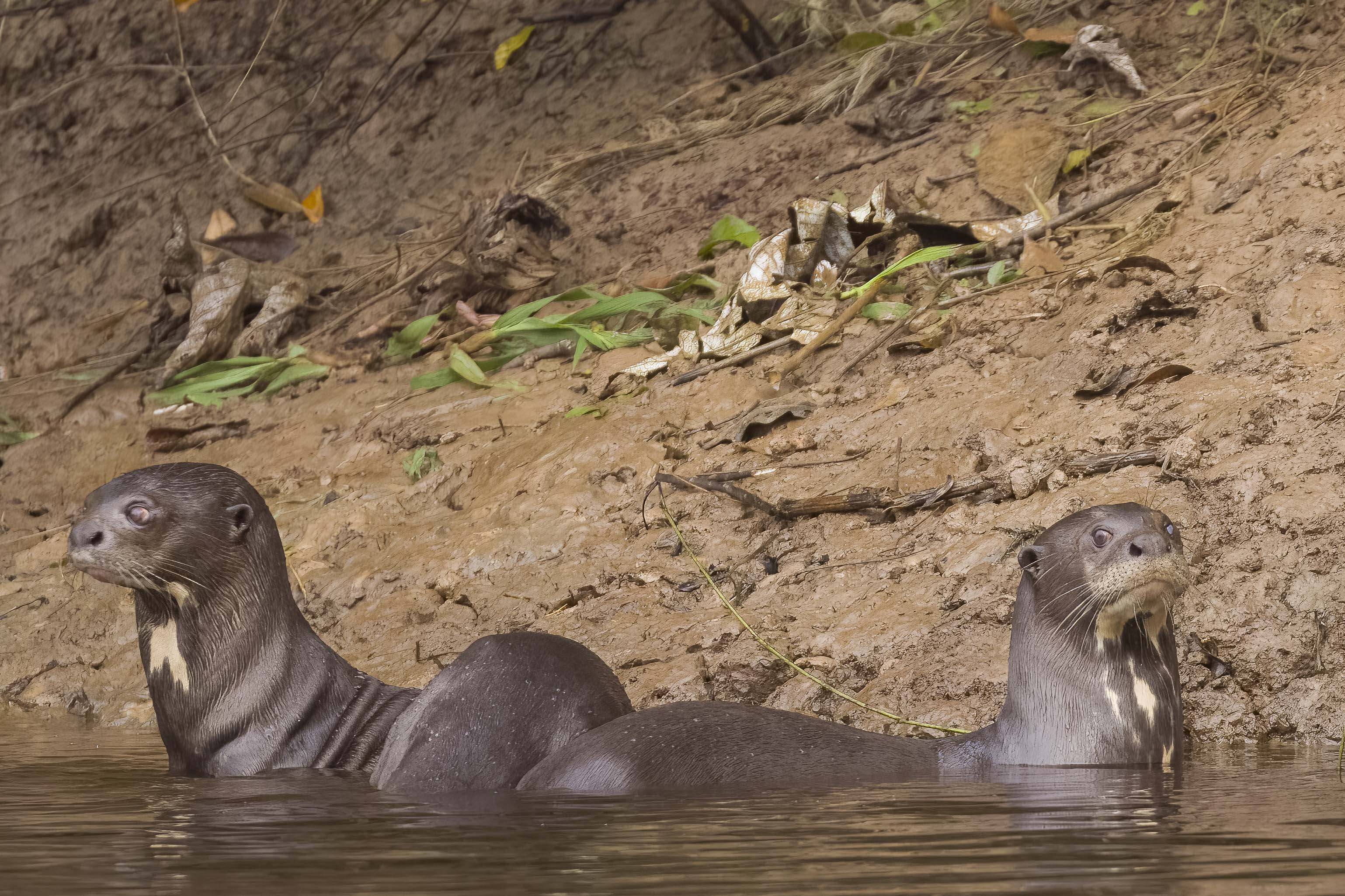 Shortly after having stopped briefly at the first ranger station to show our permits, we found a large family group of at least eight giant river otters. One of the top predators in the area, the giant river otters regaled us with great views for a long time and we had the immense pleasure to watch their antics on shore and sliding down the riverbank into the water and even to listen to their calls. We found a couple more family groups later on, but this first one was the best and the perfect welcoming committee to the Samiria.