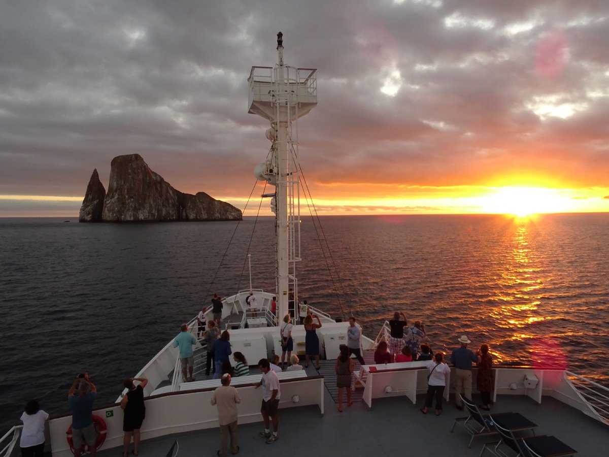 We kept navigating until we got to “Cerro Brujo” and there we got ashore for a coastal walk; there we encounter Galapagos sea lions, a lonely juvenile black tipped reef shark, fishing blue footed boobies and brown pelicans. Towards the end of the afternoon we returned to our ship and headed towards Puerto Baquerizo Moreno while the sun was setting at the horizon.