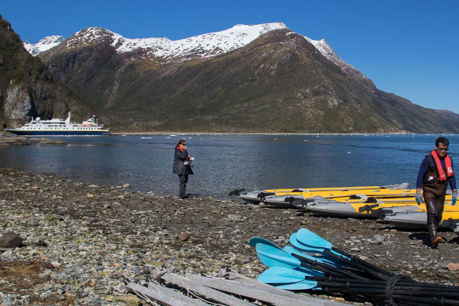The Beagle Channel stretched out before National Geographic Orion as the breakfast bells rang. We spent the first part of the day cruising through the waterway, taking in the finest scenery Patagonia has to offer, with incredible weather. After lunch we moved up Seno Garibaldi Fjord to make a landing on a small island in the midst of floating glacial ice. Here we took hikes and paddled kayaks, for those so inclined. Back aboard we enjoyed cocktails on the bow and the ship moved close to the glacier for an epic view of calving and ice-gazing.