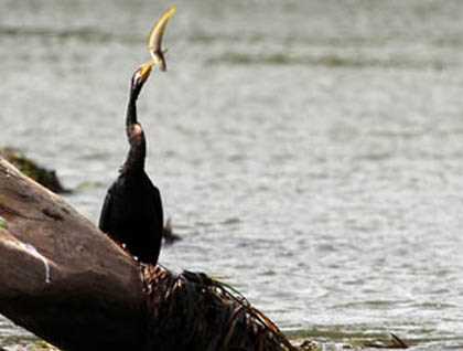 Those that did the latter had an early start. We passed through immigration, and then loaded onto the bus on the small but bustling Wyndham jetty. The driver took us through the tilted sandstone landscapes, and we soon found ourselves on a comfortable three engine boat. Our journey took us ‘up river,’ past the Melaleuca paperbarks, Pandanus, Kimberley Boabs, and Eucalyptus trees. On way we stopped to watch an Australasian Anhinga, a relative of the cormorants, ducking and weaving under the freshwater currents. He popped up several times, his sharp knife-like bill angled up, his eye watching us. After a few more dives, he bounced up with an eel-tail catfish skewered on his beak.
