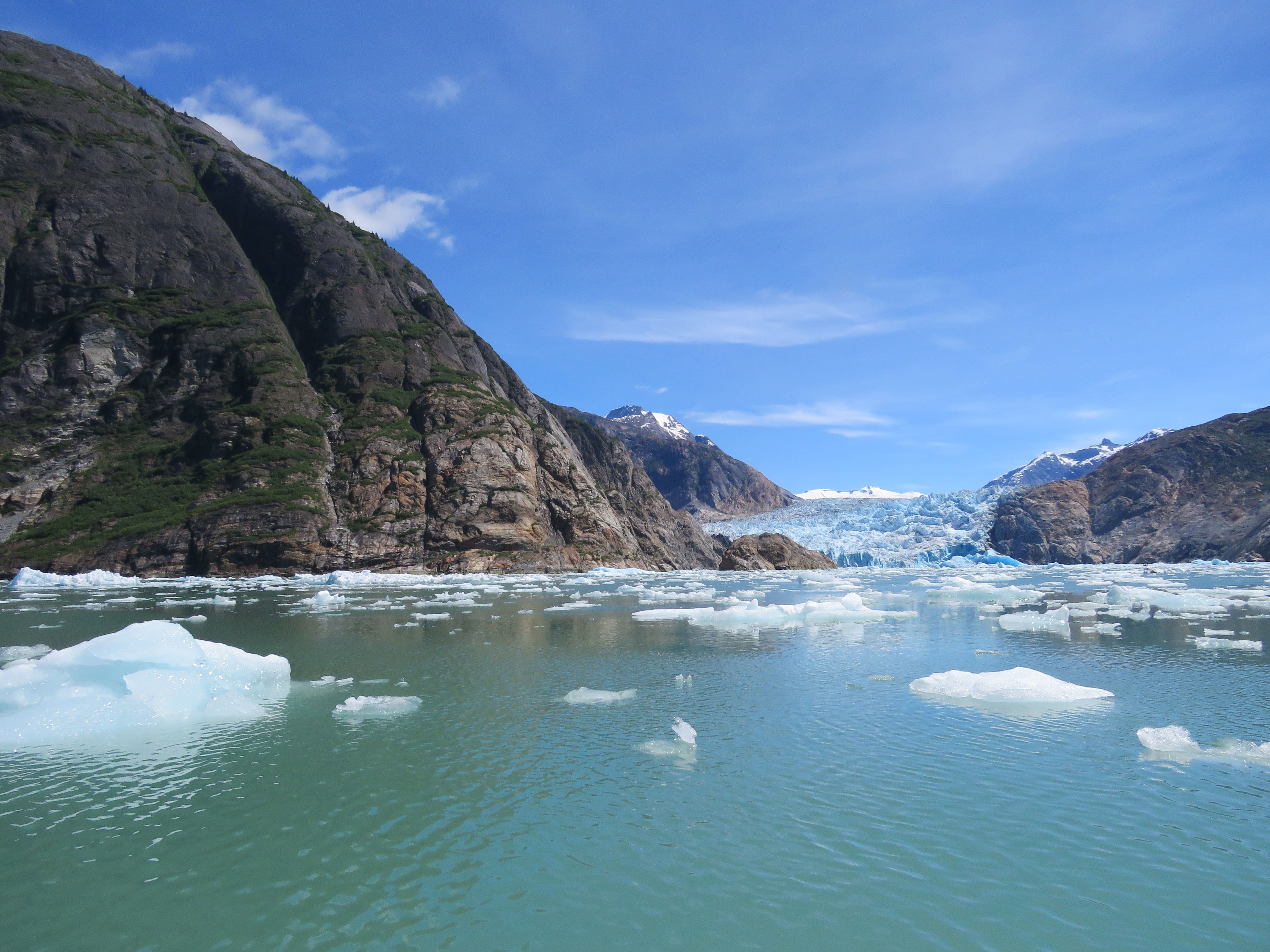 We awoke this morning on National Geographic Quest in the calm waters of Holkham Bay at the entrance to the Tracy Arm-Fords Terror Wilderness. This wilderness, established in 1980, is over 650,000 acres in size and surrounds both Tracy and Endicott Arm Fjords. The morning began gently with a stretch class on the sundeck and a delicious breakfast in the dining room. We spent the early morning hours cruising for wildlife and we were not disappointed. Many of us on the bow were delighted to encounter some humpback whales spouting as they traveled through the glassy, calm, ice-laden waters. Rab, our expedition leader, then introduced us to life aboard the vessel and gave us tips and tricks for kayaking, hiking, and Zodiac cruising in this awesome place. The National Geographic Global Explorers met on the sundeck for some ‘get to know you’ games and to begin work in our Field Notebooks. Ryder offered us a great program on expedition photography and then we broke into small groups to learn more about our individual cameras. After lunch we headed out for our first Zodiac excursions amongst the beautiful ice of Endicott Arm near Dawes Glacier.
