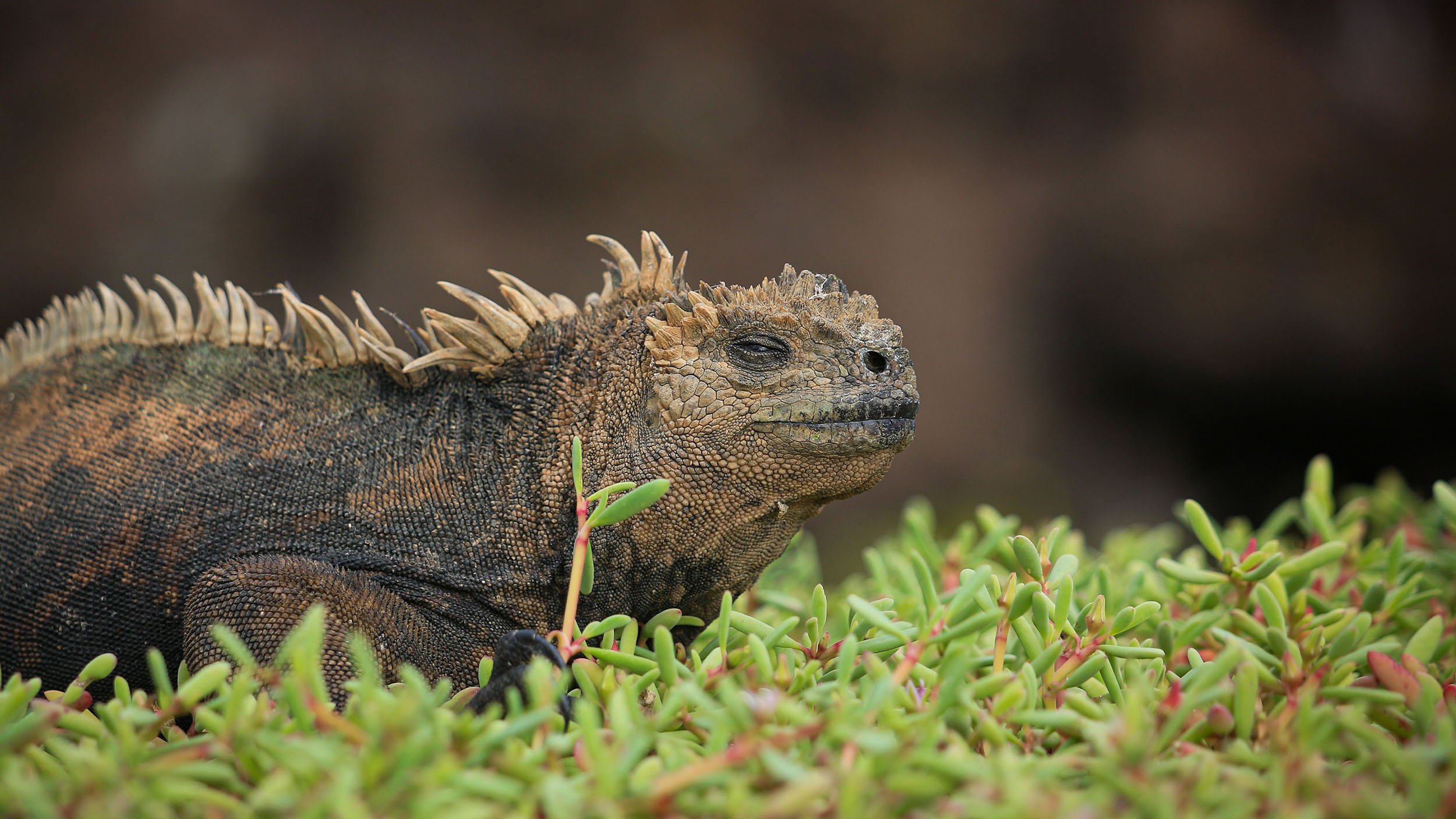 On our afternoon walk we found the most iconic reptile of the Galápagos: the marine iguana (Amblyrhynchus cristatus). It is endemic to the islands. This iguana was basking on the sesuvium for sun; a beautiful contrast of colors and nature. —Felipe Wittmer Naranjo, Naturalist